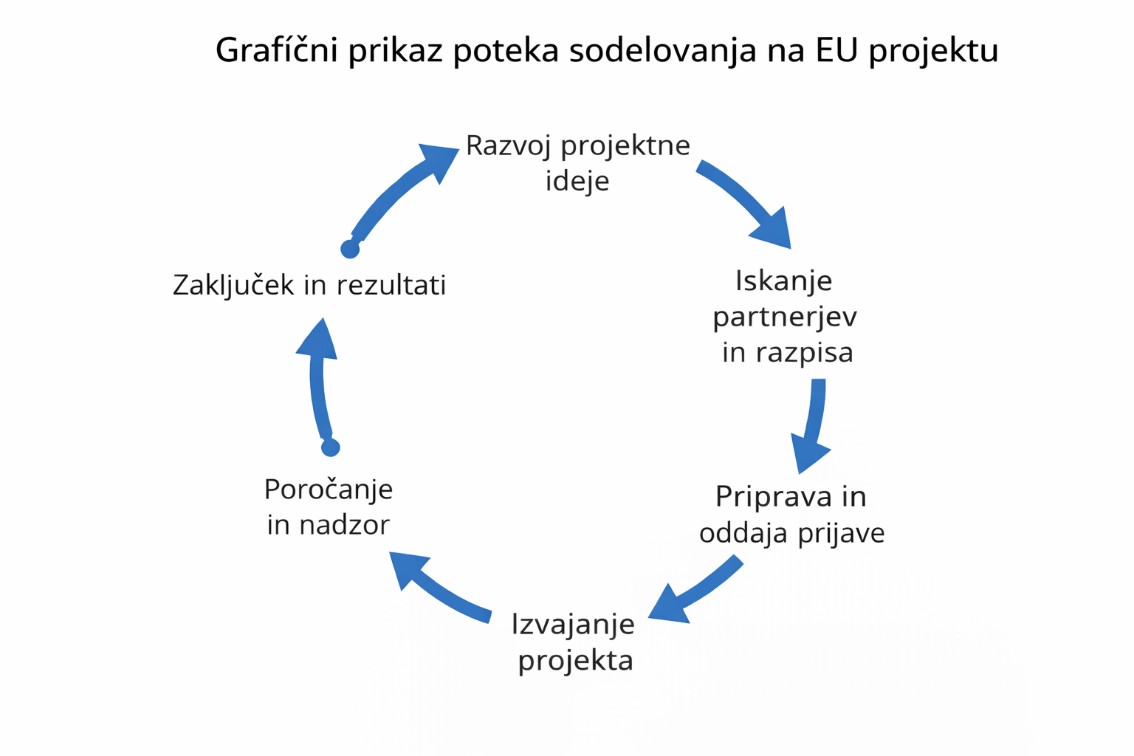 - Razvoj projektne ideje (Najprej se opredeli problem, cilj in vsebina projekta. Projektna ideja mora biti skladna z razpisnimi cilji EU. V tej fazi se preveri, ali je ideja primerna za sofinanciranje).